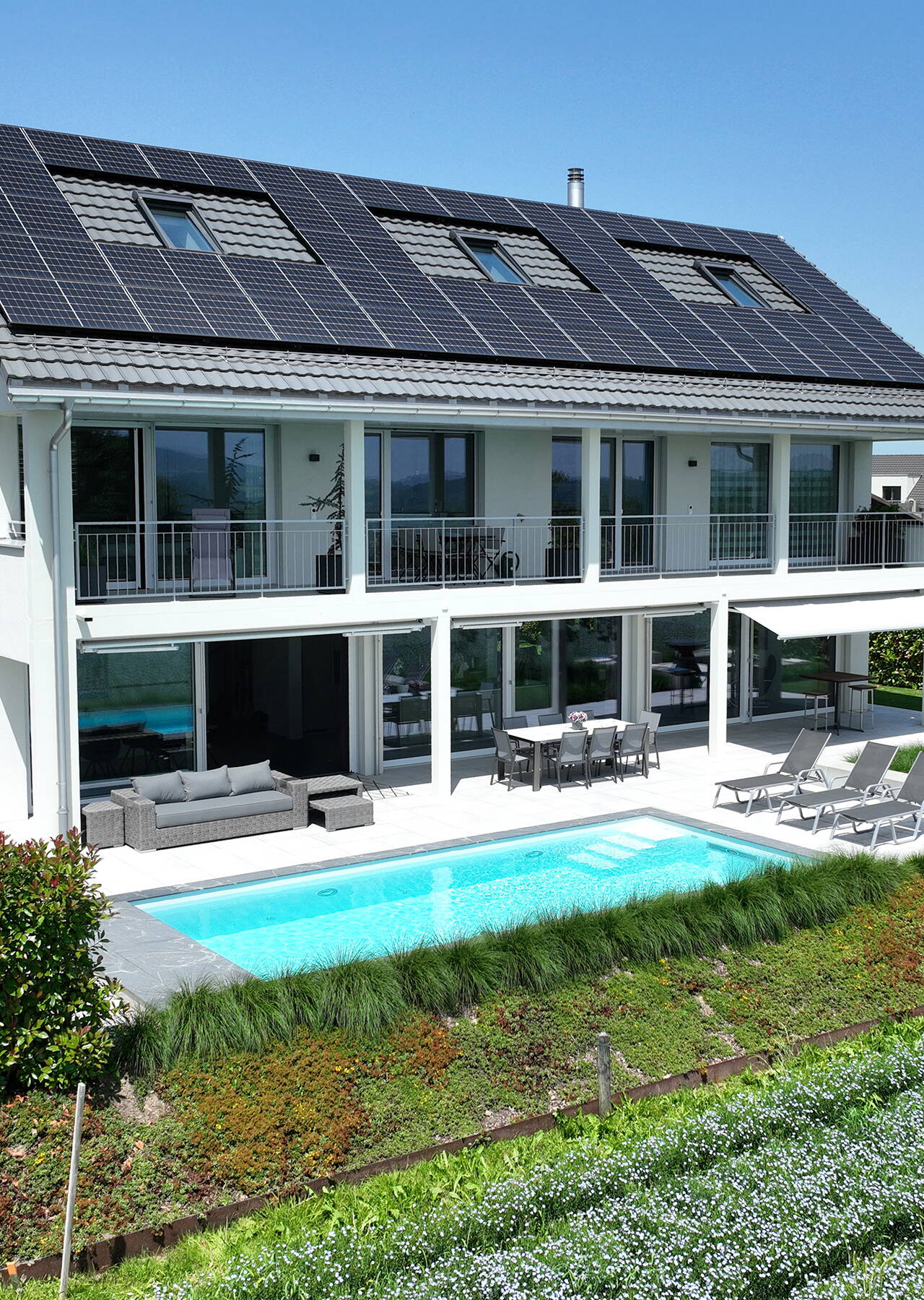 Moderne Haustechnik wie Luftwasser-Wärmepumpe mit Freecooling-Funktion, Photovoltaikanlage und Alarmanlage ergänzen das Angebot auf ideale Weise. Abgerundet wird es durch die geräumige Doppelgarage, die zusätzlichen Komfort bietet.